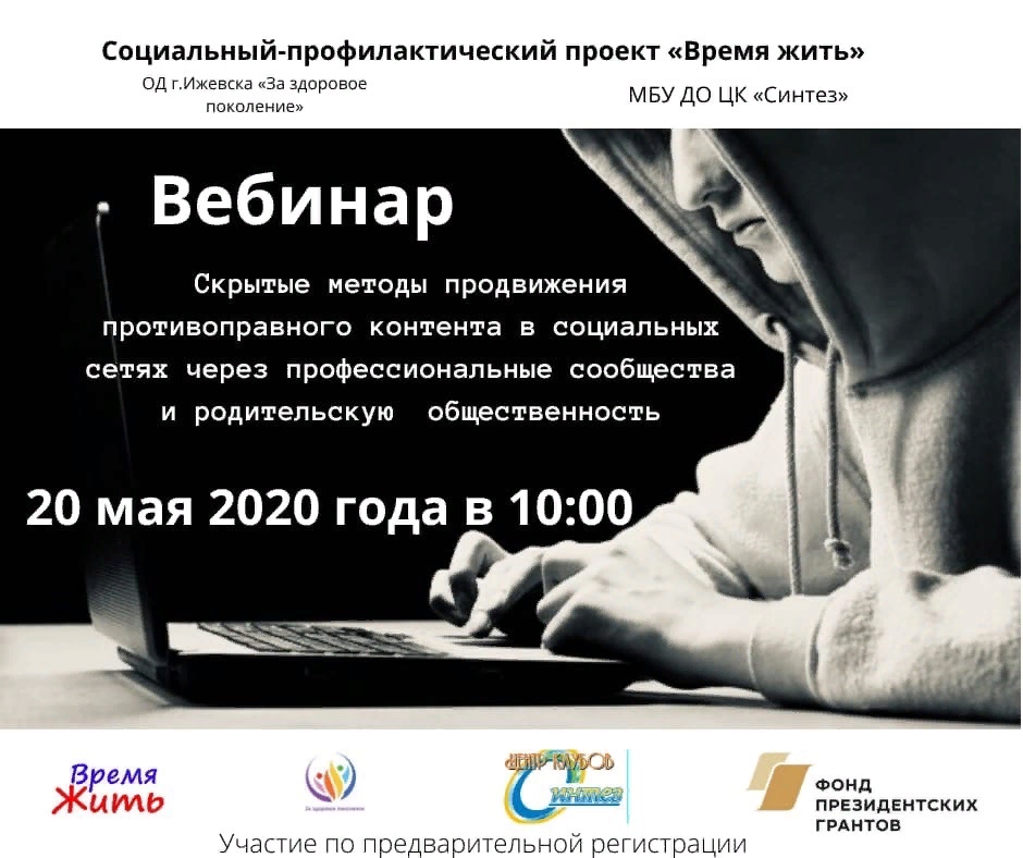 20.05.2020 г. в 10-00 ч. приглашаем на вебинар "Скрытые методы продвижения противоправного контента в социальных сетях через родительскую общественность и профессиональные сообщества"