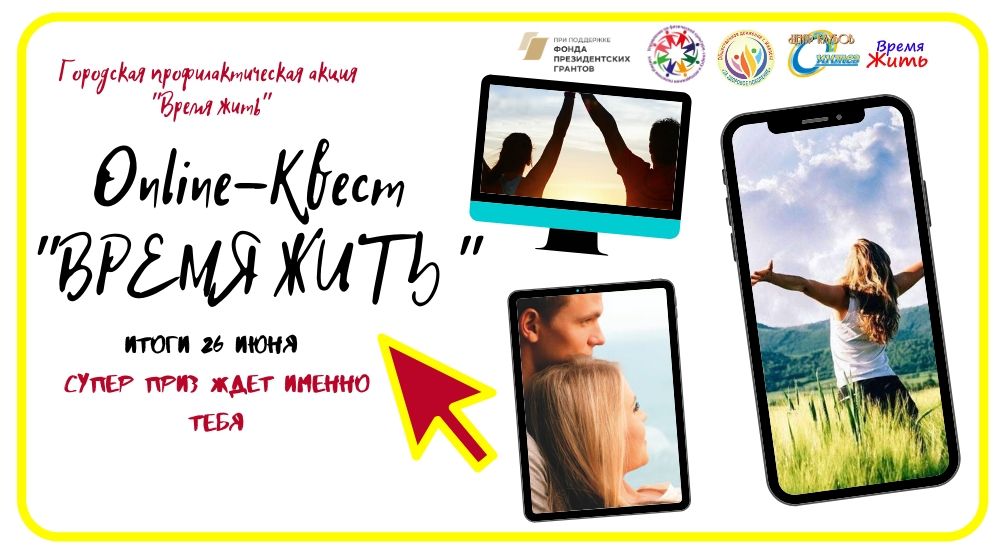 ❗С 22 по 26 июня состоится городская профилактическая акция «Время жить», приуроченная к Международному дню борьбы с употреблением наркотических средств и их незаконным оборотом. ☝Организаторами Акции являются Муниципальное бюджетное учреждение дополнительного образования «Центр клубов «Синтез», Общественная организация г. Ижевска «За здоровое поколение», Управление по физической культуре, спорту и молодежной политике Администрации города Ижевска. К участию в акции приглашаются: ✅учащиеся Центров клубов города Ижевска, ✅молодежь, подростки, дети и жители г. Ижевска. ☝Акция проходит в онлайн-формате в форме квеста, участники будут проходить задания через специальную интерактивную платформу в сети Интернет, ссылка на онлайн-платформу https://sites.google.com/view/kvest-vremya-zhit/ главная-страница ✨Задача квеста - найти все зашифрованные в заданиях способы профилактики ПАВ. Перед началом квеста всем участникам необходимо пройти регистрацию. ✅В ходе выполнения квеста участникам нужно выполнить задания и занести результаты в таблицу «Шаги к успеху». ??Победителям будут вручены призы и дипломы Управления по физической культуре, спорту и молодежной политике Администрации города Ижевска. ☝Дополнительная информация: Методист МБУ ДО ЦК «Синтез», Председатель Общественного движения г. Ижевска «За здоровое Поколение» Лысцева Е. С. 8-912-443-69-57