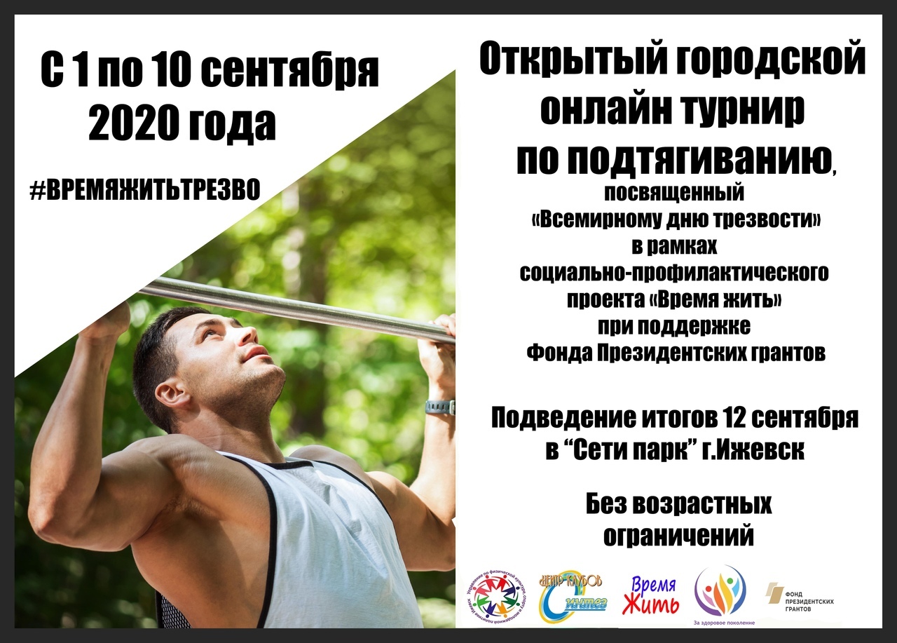 С 1 по 10 сентября приглашаем принять участие в открытом городском турнире по подтягиванию #ВРЕМЯЖИТЬТРЕЗВО организованным ОД За здоровое поколение и Центром клубов «Синтез».Устиновский район.Ижевск при поддержке Фонда президентских грантов