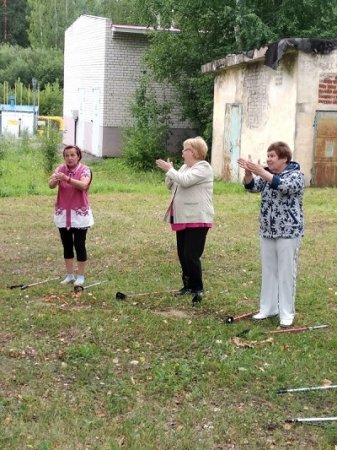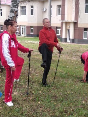 Тренер по скандинавской ходьбе проводила с участниками утреннюю зарядку и обучала правилам ходьбы..