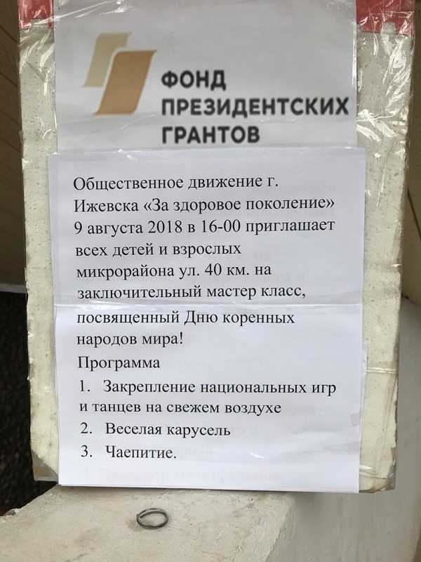 В течение трех дней (26 июля, 2 и 9 августа 2018 года) на площадках перед офисом и в офисе Общественного движения г. Ижевска "За здоровое поколение" в рамках реализации проекта «Тепло родного дома» с использованием гранта Президента Российской Федерации на развитие гражданского общества, предоставленного Фондом президентских грантов в целях расширения кругозора и закрепления знаний о национальных праздниках и национальных традициях удмуртского, русского и татарского народов, проведен мастер- класс для жителей ул. 40 км.